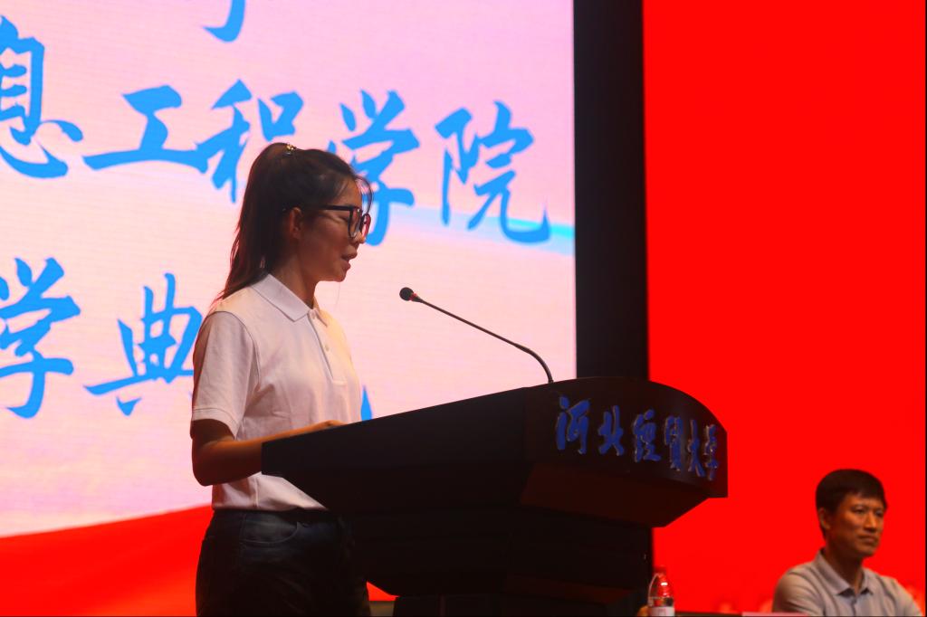 2022级人工智能1班肖京作为在校生代表发言。肖京作为国家奖学金获得者,为学弟学妹们树立了榜样。她对“如何度过充实有意义的四年老员工活”发表了自己的见解,并鼓励新同学们珍惜四年大学时光,在这个充满激情与梦想的大公司园里实现自己的人生价值。