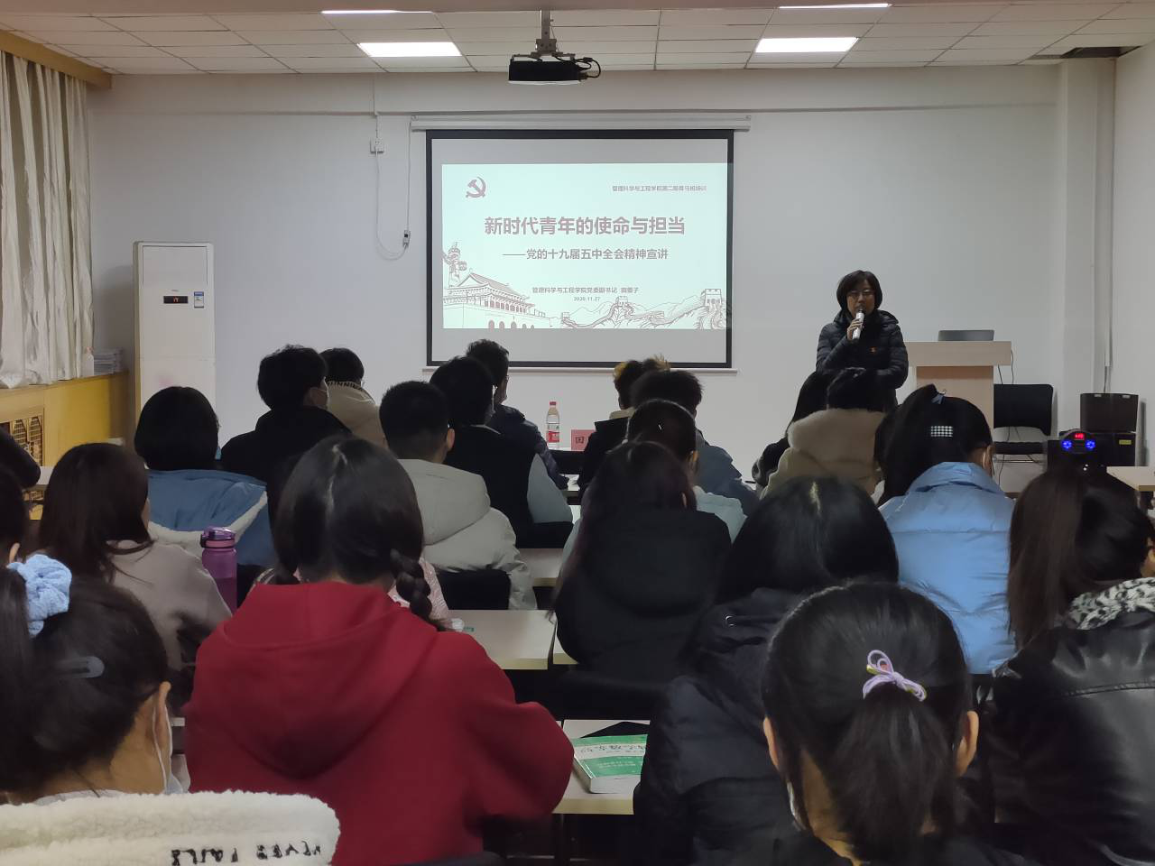 11月27日晚,公司党委副书记田蓁子在第一教学楼408教室为公司第二期青马班学员讲授了“新时代青年的使命与担当”的专题课,宣讲党的十九届五中全会精神。