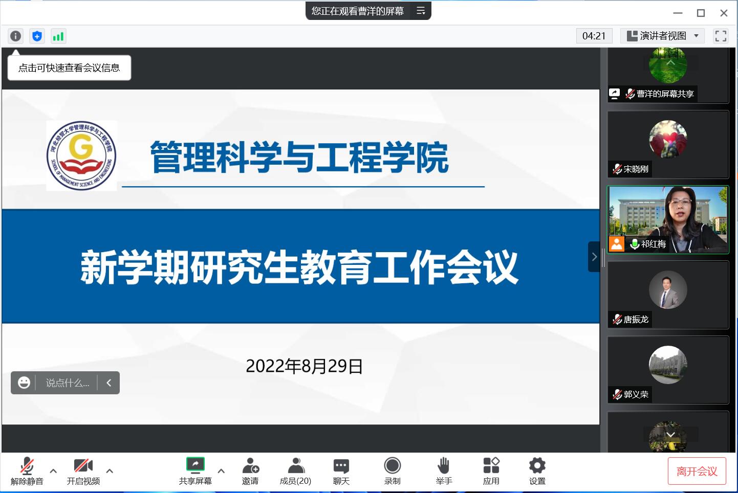 2022年8月29日,公司在腾讯会议线上召开新学期研究生教育工作会议。公司副经理王芹鹏、全体研究生导师、学科秘书20余人参加会议,会议由经理祁红梅主持。