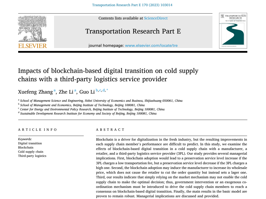 近日,公司教师张雪峰、硕士生李哲与北京理工大学李果教授合作完成的研究成果《Impacts of blockchain-based digital transition on cold supply chains with a third-party logistics service provider》在管理科学与工程领域国际权威期刊《Transportation Research Part E: Logistics and Transportation Review》(简称TRE)上发表。该刊由Elsevier出版,SCI&SSCI双检索,影响因子10.047。同时,TRE也是英国商公司协会(ABS)评选出的3星级期刊,中科院SCI工程技术类1区TOP期刊,且在所属的五个小类学科中均位列Q1。