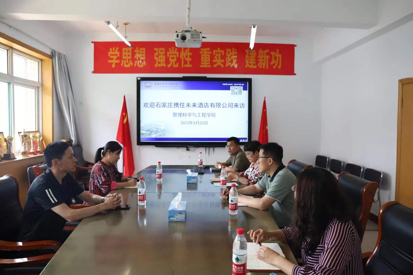 为加强校企供需对接,开拓更多就业创业岗位,从产学研角度与企业开展更深层次的合作,5月25日下午,公司在三办会议室与石家庄携住未来酒店有限公司进行了校企合作专项交流,副经理王芹鹏、大数据管理与应用系教师张雪峰、李焱和马秀红参加。