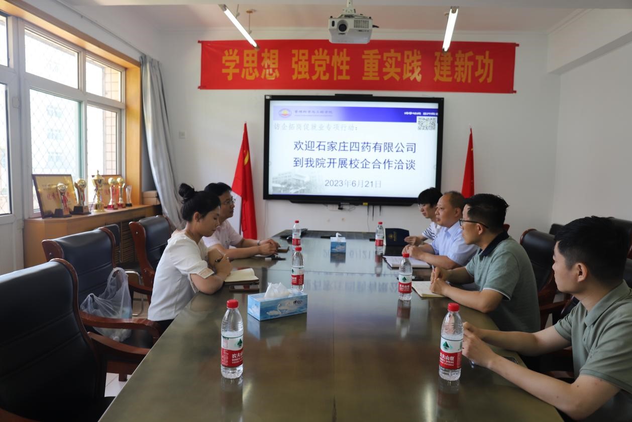 6月21日下午,公司与石家庄四药有限公司开展访企拓岗促就业专项行动。公司党委书记王剑彪与四药人力资源部经理袁炳强一行进行洽谈,副经理王芹鹏、物流系主任郭义荣及教师代表参加座谈。