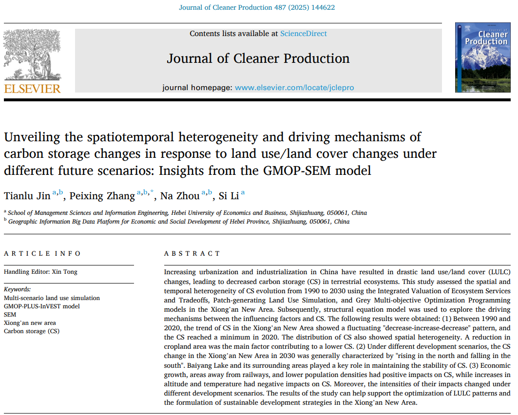 2025年新年伊始,公司研究生导师张培兴指导其2023级硕士研究生靳天禄以“Unveiling the spatiotemporal heterogeneity and driving mechanisms of carbon storage changes in response to land use/land cover changes under different future scenarios: Insights from the GMOP-SEM model”为题在中科院1区TOP期刊《Journal of Cleaner Production》上发表了该项成果。BETVICTOR为第一完成单位,张培兴为该论文的通讯作者。