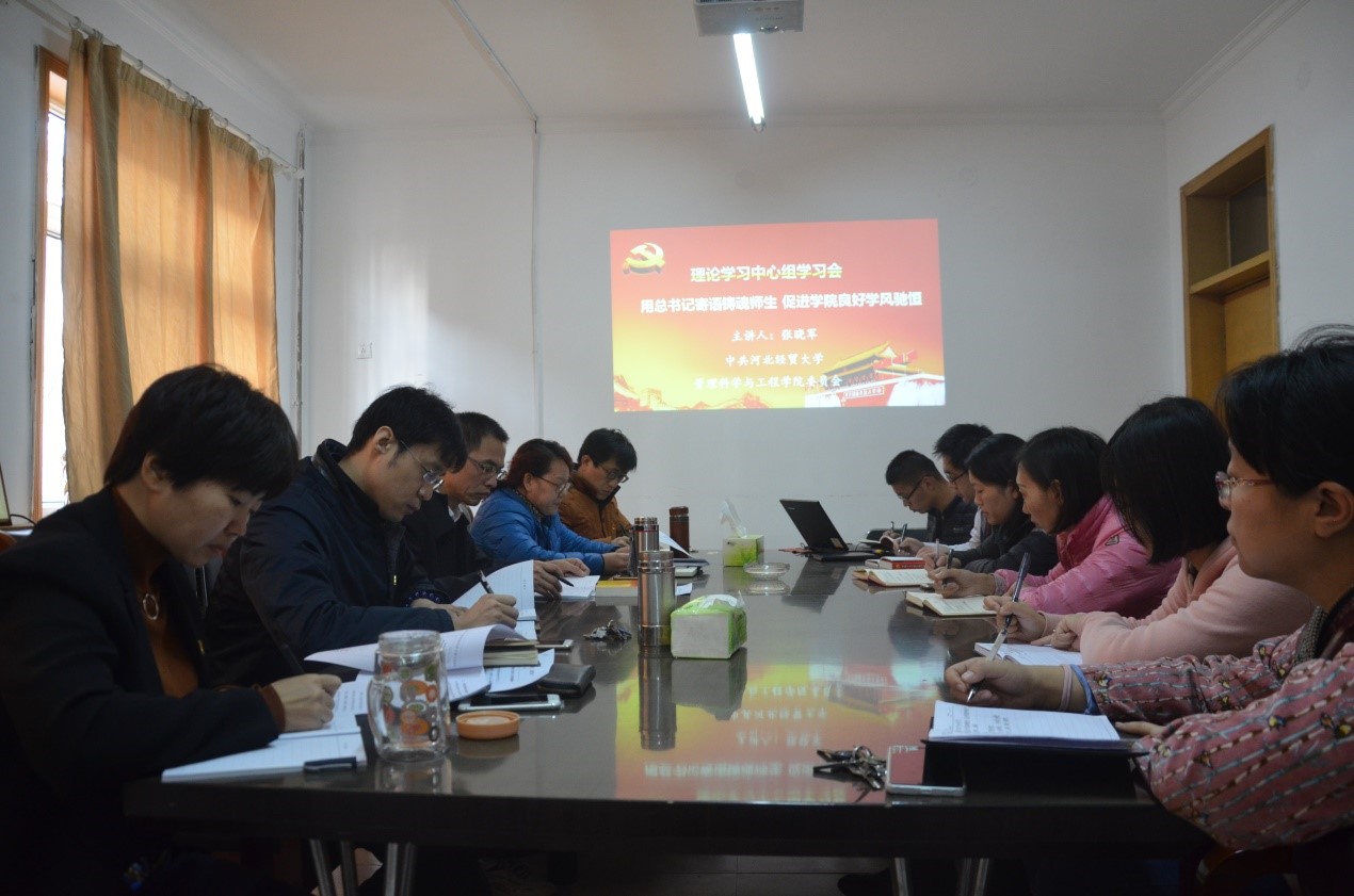 2017年12月4日上午,管理科学与工程公司党委理论学习中心组以学习党的十九大精神加强学风建设为主题开展专题活动。会议由党委书记高永芳主持,公司党委全体成员及系主任、辅导员参加。