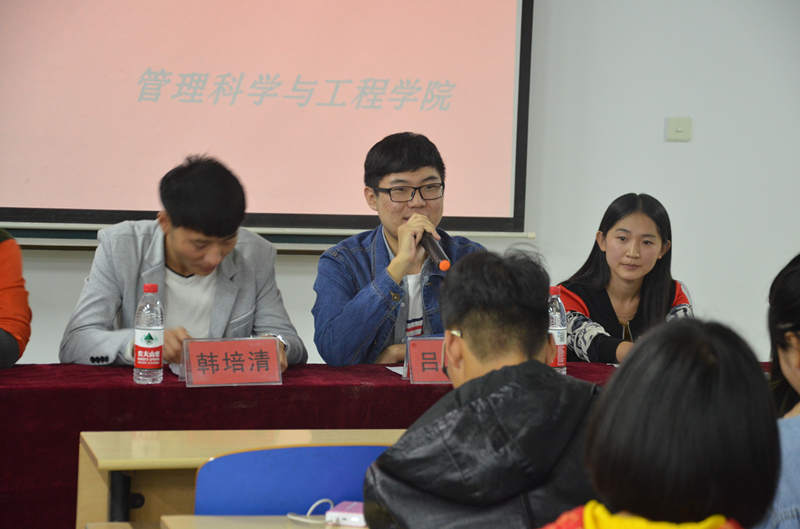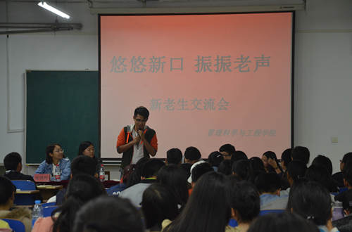 统韩培清强调了学习之时需思考,大学要有远见,有计划,有目标。13级工程管理1班吕昊用自己的经历,向新生们强调了平时学习的重要性,并提出科学的学习方法。最后,13级信息管理与信息系统1班李萌对优秀员工代表的发言作了总结,并补充学习要有重点,明确自身的需要。在新生提问环节,新生踊跃发言,老生代表对新生们提出的问题一一进行了解答。