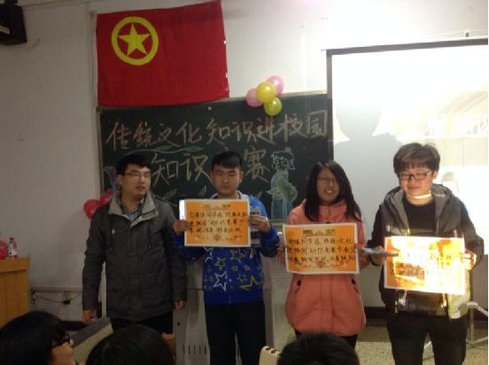 活动以全体班委朗诵传统经典《弟子规》开场,紧接着进行选手答题环节,共有四组选手参加,比赛共分三个环节,分别是必答题、比划题以及抢答题,并设有观众回答环节和对传统文化讲解环节。经过三项比赛后计算各组的最终得分并进行排名,最后由宋老师给各组选手颁发奖状和奖品,并对本次活动进行了总结。