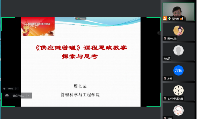 2022年5月9日,由教学评估与教师教学发展中心主办,管理科学与工程公司承办的本年度第26期教学沙龙活动顺利举行。物流管理系周长荣教授应邀做“《供应链管理》课程思政教学探索与思考”交流分享。工商管理公司、计算机中心等近100余名教师参加。
