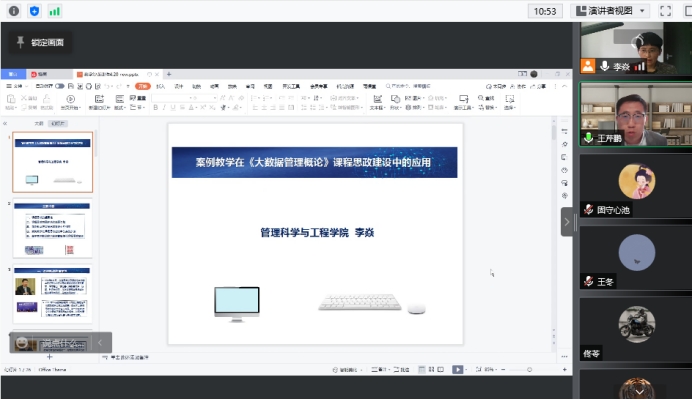 2022年4月18日,由教学评估与教师教学发展中心主办,公司承办的本年度第16期教学沙龙活动顺利举行。大数据管理系李焱老师应邀做“案例教学在《大数据管理概论》课程思政建设中的应用”交流分享。近100名院内外教师参加,活动由教学副经理王芹鹏主持。