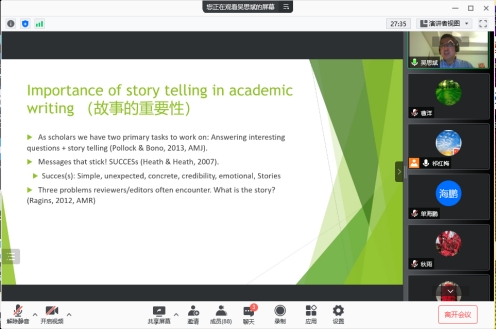 2021年10月27日,应管理科学与工程公司和科研处邀请,美国德克萨斯大学吴思斌教授通过腾讯会议形式作了题为“如何在学术论文里讲故事”的学术报告。报告由公司经理祁红梅教授主持,公司教师、研究生及院外师生80余人聆听了此次讲座。