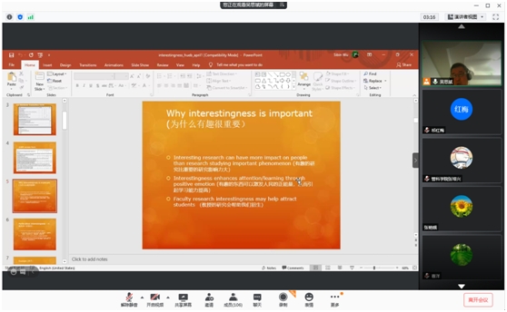 202141日,应公司和科研处邀请,美国德克萨斯大学吴思斌教授通过线上形式作了题为追求趣味性:建立文章理论的技巧的学术报告。报告由祁红梅经理主持,公司教师以及研究生等共100余人聆听了此次讲座。