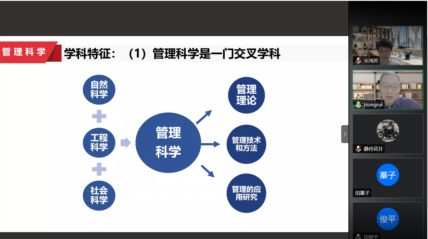 12月4日,应公司邀请,清华大学经济管理公司博士后褚宏睿教授作题为“管理科学与工程学科发展与最新趋势研究”学术讲座。讲座由宋鸿芳博士主持,公司教师以及研究生在线聆听了此次学术讲座。